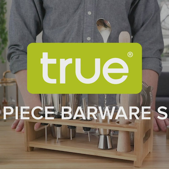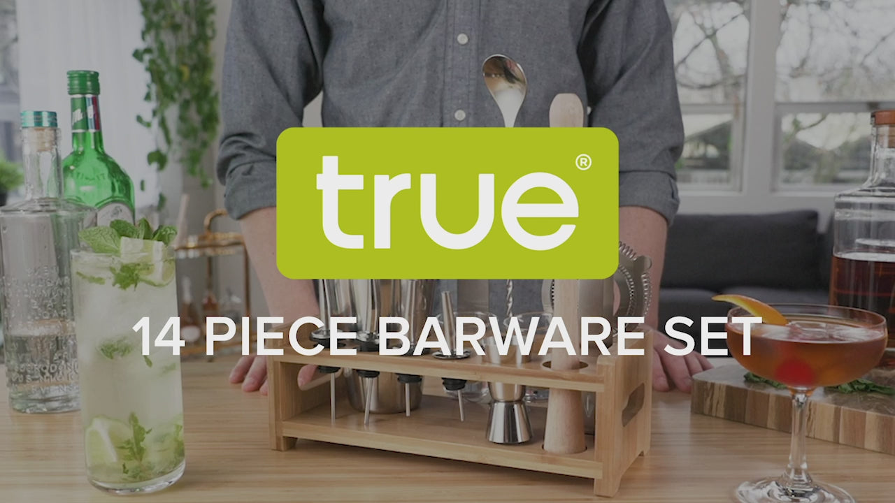 Specifications: • Materials: Premium stainless steel and glass • Pieces: 14-piece complete set • Shaker: Boston-style tin and glass • Jigger: Double-sided measurement • Storage: Elegant wooden display stand