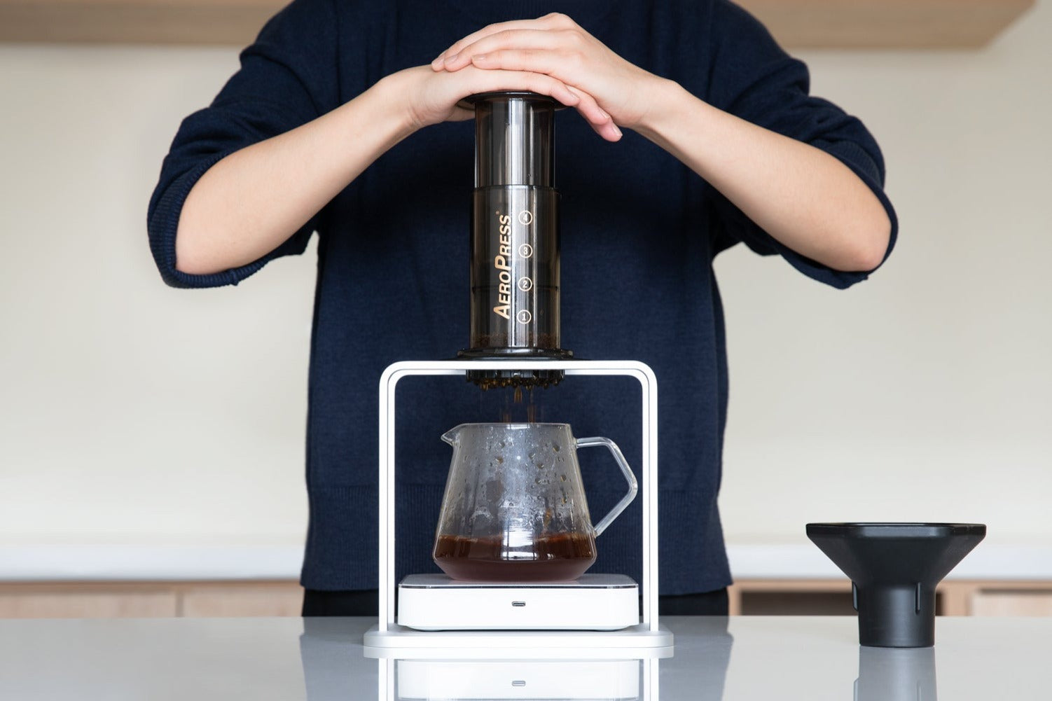 AeroPress Force Distribution Structural engineering withstands the concentrated downward pressure generated during AeroPress plunger depression—force that can damage scale load cells when applied directly. The stand's rigid construction distributes this pressure across its frame rather than transmitting shock loads to the measurement platform, protecting scale precision while enabling accurate beverage weight tracking through the complete extraction sequence.